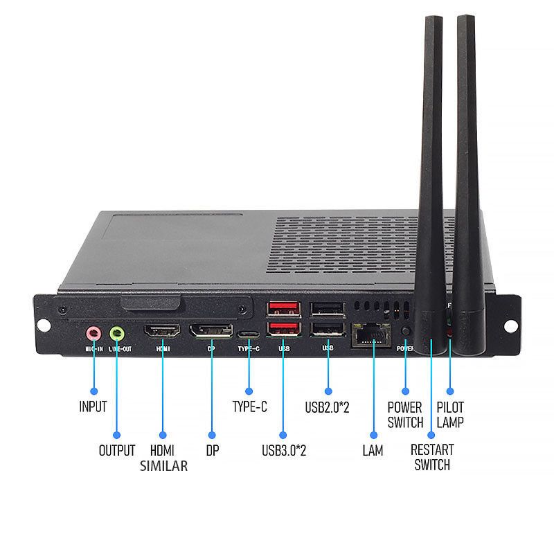 لدينا وحدة OPS PC يحتوي على إدخال / إخراج: 4 X USB 3.0، 4 × USB 2.0، 2 X COM، 1 X LPT، 2 X Intel I210AT Gigabit Ethernet، 1 X HD-MI، 1 X VGA، و 12 فولت DC في مصدر الطاقة. إنه الحل المثالي لوحدة أندرويد أوبس،مما يسمح لك بتخصيص جهازك بسهولة.